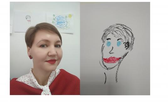 Смотрите на фотографию - там я и мой автопортрет. Это у нас было такое практическое задание - нарисовать себя в любой технике, хоть в виде пейзажа, хоть крынки с молоком. Затем мы комментировали эти портреты и рассказывали свои впечатления от них.