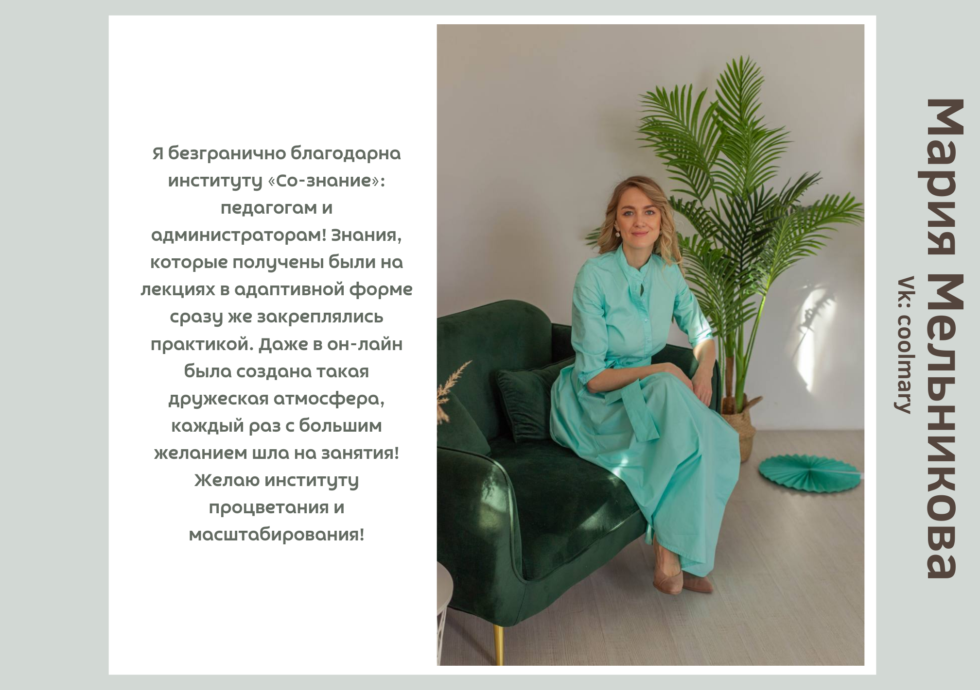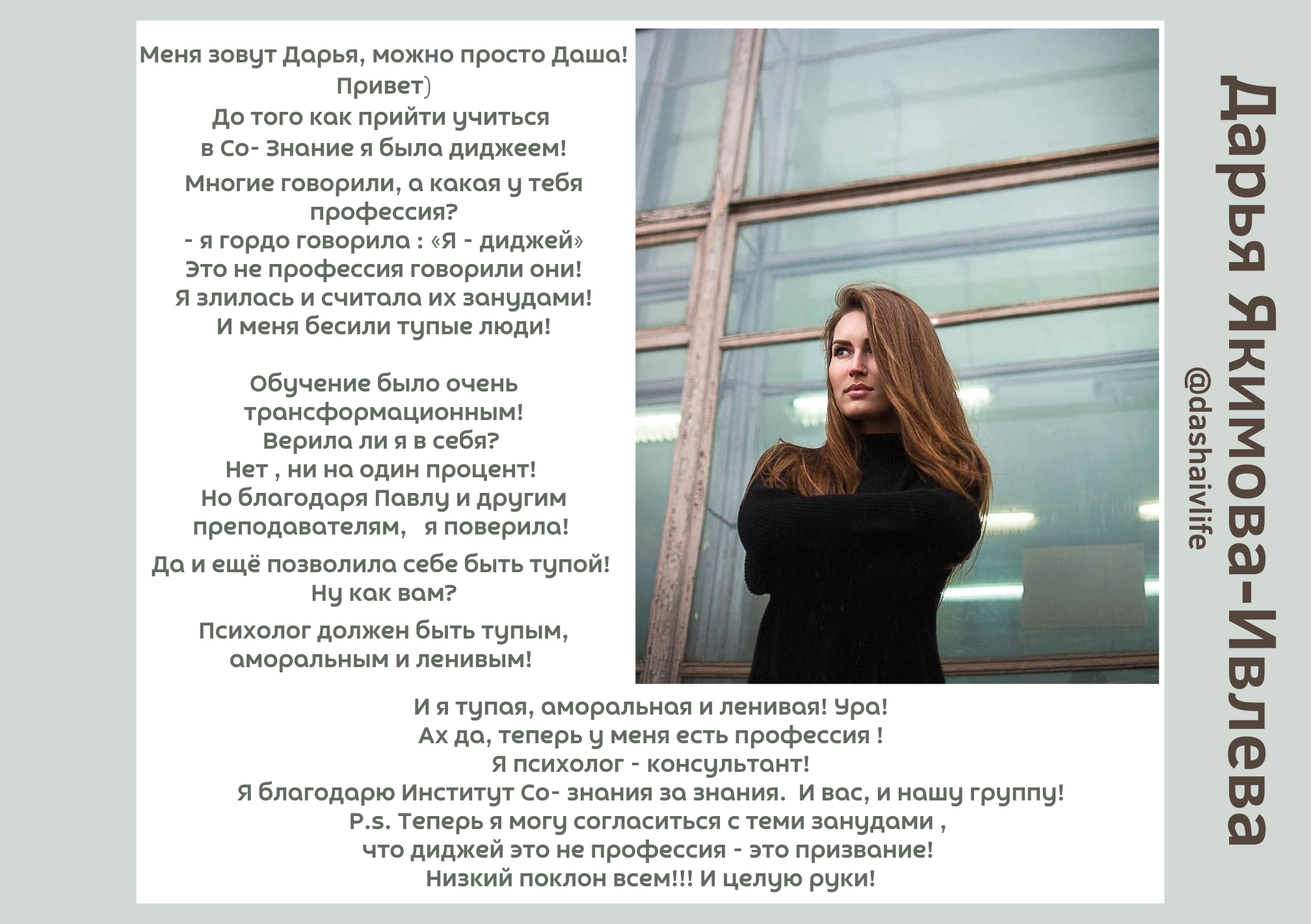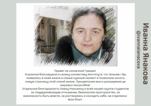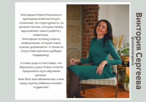 Возможность задавать вопросы во время занятий, уточнять информацию. В том числе – личные вопросы (про себя). Опробовать различные техники на практических занятиях.